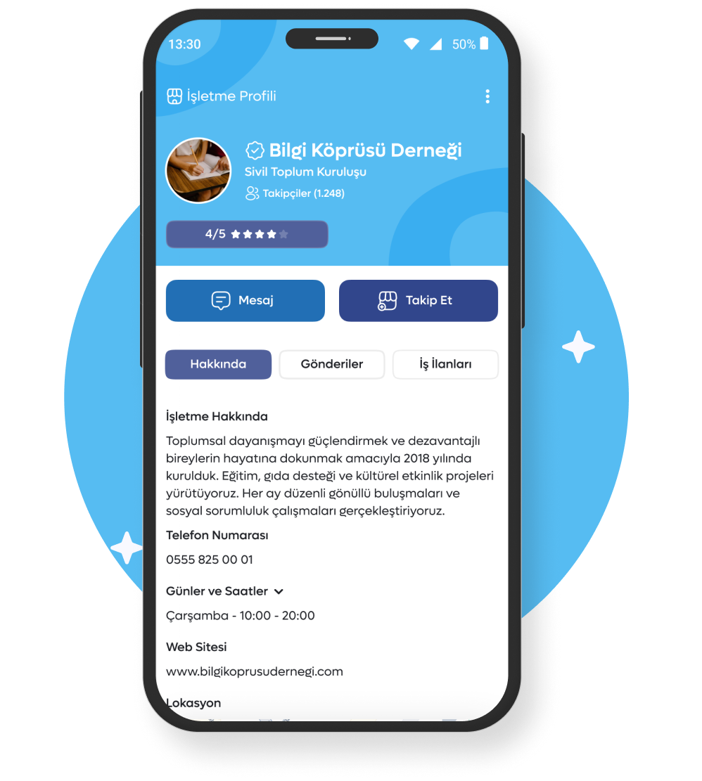 Naberise İşletme Hesapları ile mahalle ve ilçenizdeki komşulara doğrudan ulaşma fırsatı yakalarsınız. Hizmet verdiğiniz mahalle ve ilçede yaşayan Naberise kullanıcılarına paylaşımlarınız gösterilir. Bu sayede kurumunuzla ilgili en güncel bilgileri doğru kitleye hızlıca duyurabilirsiniz.